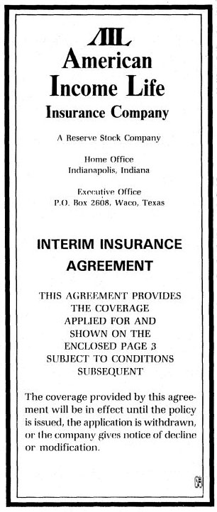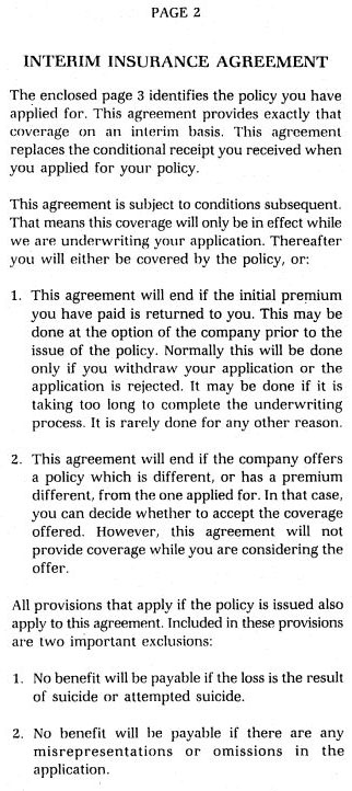 | This is the front side of the interim agreement which is sent on the 28th day after the application date on cases which have not yet been issued. It is folded with a near version of the detail page that will be in the policy when issued, placed in a plastic sheath, and mailed. |